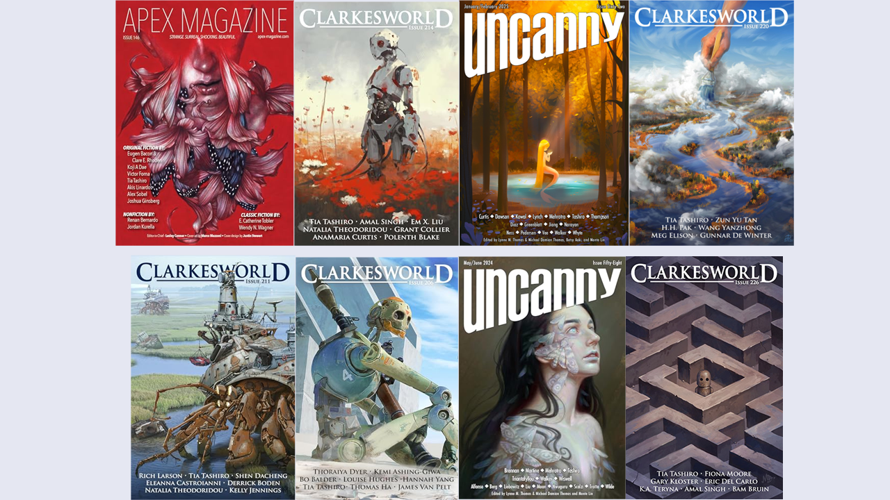 Tia Tashiro is a speculative fiction author and a scientist. She was a finalist for the 2025 Astounding Award for Best New Writer; her short fiction has been published in Clarkesworld, Uncanny, and Apex. She’s also one of the rotating Editors in Chief of Wyrmhole Magazine.